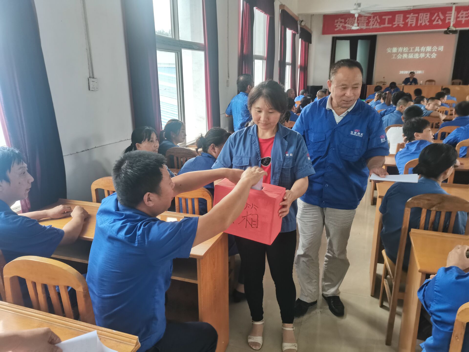 2020年7月28日,公司工會在大會議室召開會員大會,會議由第二屆工會主席劉曉峰同志主持,會上儲  哲同志宣讀了選舉辦法,全體會員以舉手表決的方式通過選舉辦法和總監票人名單,并以無記名投票的方式選舉產生了第三屆工會委員會,選舉王曉建同志為主席,儲  哲、儲成鳳、儲德江、陳尊岳四同志為委員。